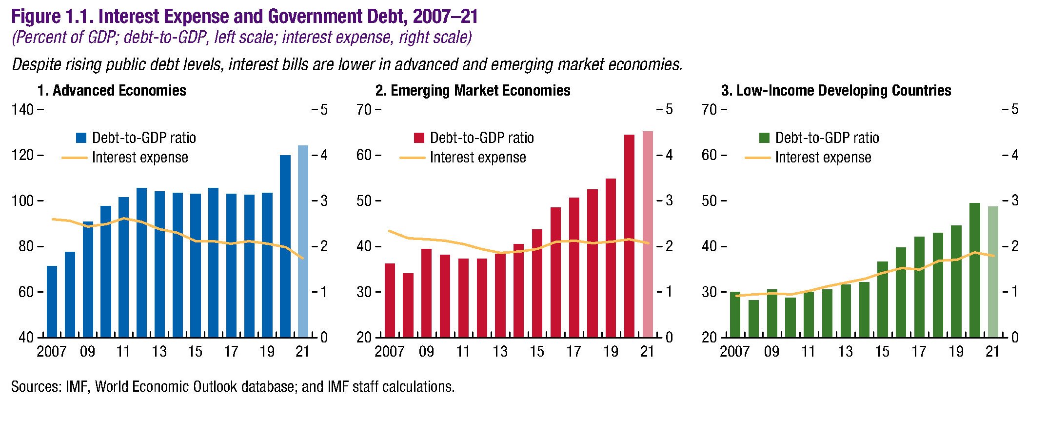 Mentre nelle economie avanzate la spesa per gli interessi sul debito è diminuita al crescere del rapporto debito/pil, nelle economie emergenti la spesa per interessi è sostanzialmente ferma da un decennio, mentre nei paesi a basso reddito è addirittura cresciuta. Questo non ha nulla a che fare con la pandemia. Piuttosto col modo in cui si è configurata l’economia internazionale, che finisce con lo svantaggiare chi ha meno.