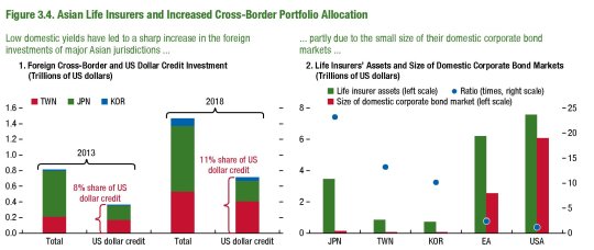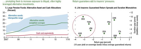 La stessa dinamica si osserva per gli assicuratori: “Rimangono ampi divari fra i rendimenti garantiti – sottolinea – e i rendimenti delle obbligazioni sovrane, nonché discrepanze fra attività e passività, in particolare in alcuni paesi europei (compresa la Germania) e i principali assicuratori asiatici. Questo ha indotto gli assicuratori ad aumentare i loro acquisti obbligazioni di maggior durata e minor rating”. Anche qui: più rischi e rendimento più incerto, ma comunque basso. Per dare un’idea di quello che sta accadendo, basta ricordare che gli assicuratori asiatici hanno praticamente raddoppiato la loro esposizione ad asset esteri, per lo più in dollari, ormai a quota 1,5 trilioni di dollari, rispetto a cinque anni fa.