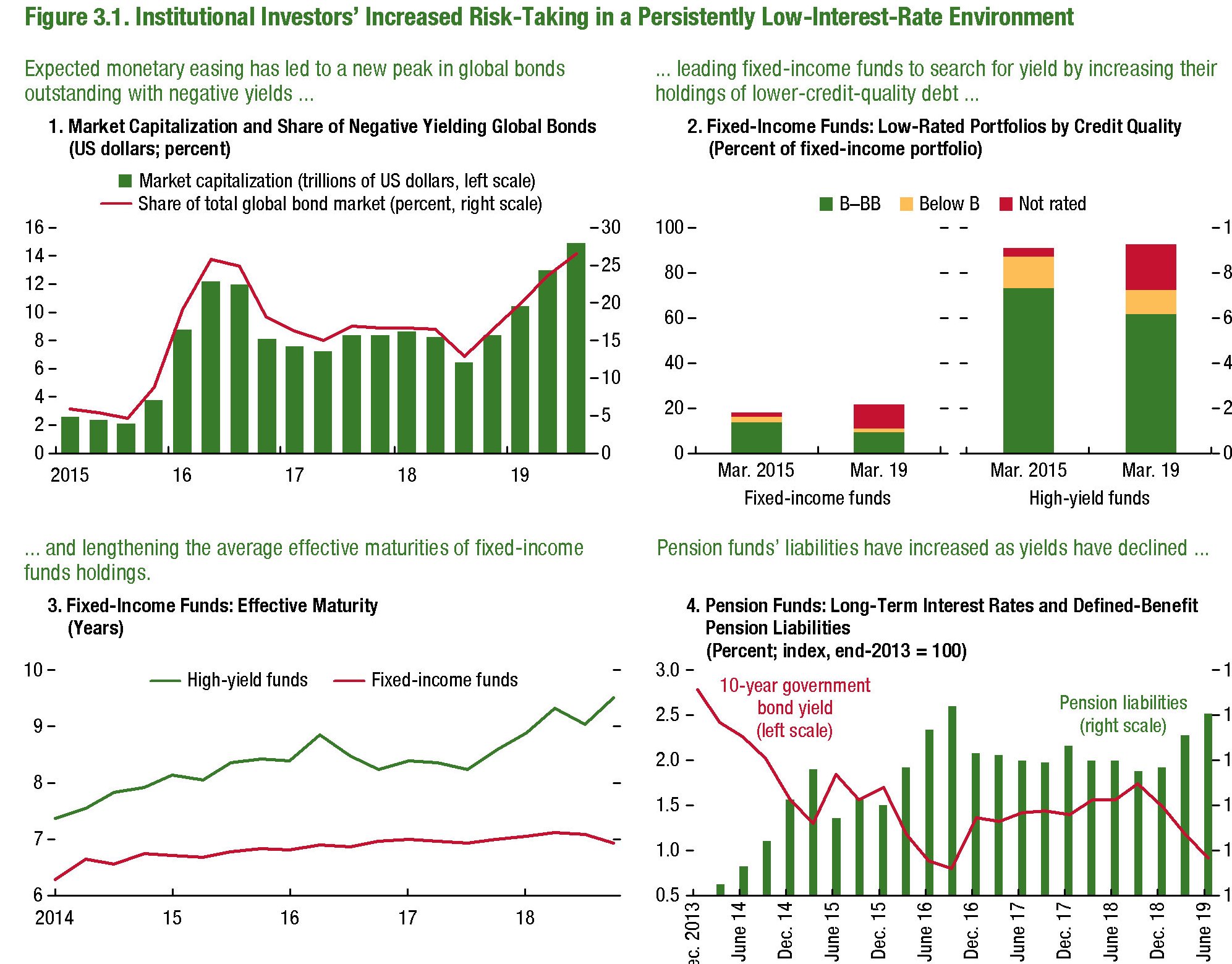 Oggi accade il contrario. L’ultimo rapporto sulla stabilità finanziaria diffuso dal Fmi (GFSR ottobre 2019) dedica un intero capitolo a come l’ambiente finanziario, ormai assuefatto a una politica monetaria allentata, abbia di fatto transitato questi soggetti – comunque costretti dalla logica del rendimento a procacciarsene uno purchéssia – dai lidi tranquilli del rendimento basso ma sicuro, a quelli assai più procellosi del rendimento basso e insicuro. Che sembrerà una contraddizione in termini, ma solo a chi non ricorda che nel mondo si scambiano, a seconda delle metriche considerate, fra i 15 e i 17 trilioni di dollari di obbligazioni a tasso negativo.