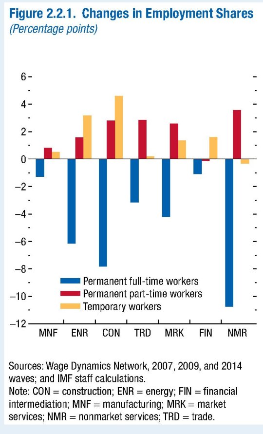 I contratti che deprimono le retribuzioni Il Fmi ha pubblicato un approfondimento molto interessante nel suo ultimo WEO, World economic outlook, nel quale mostra come l’aumento notevole registrato dal dopo crisi dei contratti parti time e a termine abbia finito col provocare una crescita al rallentatore dei salari, pure a fronte di un aumento dei tassi di occupazione e della diminuzione di quelli di disoccupazione. L’analisi del Fondo è stata fatta anche nei diversi settori dell’economia e in diverse economie avanzate.