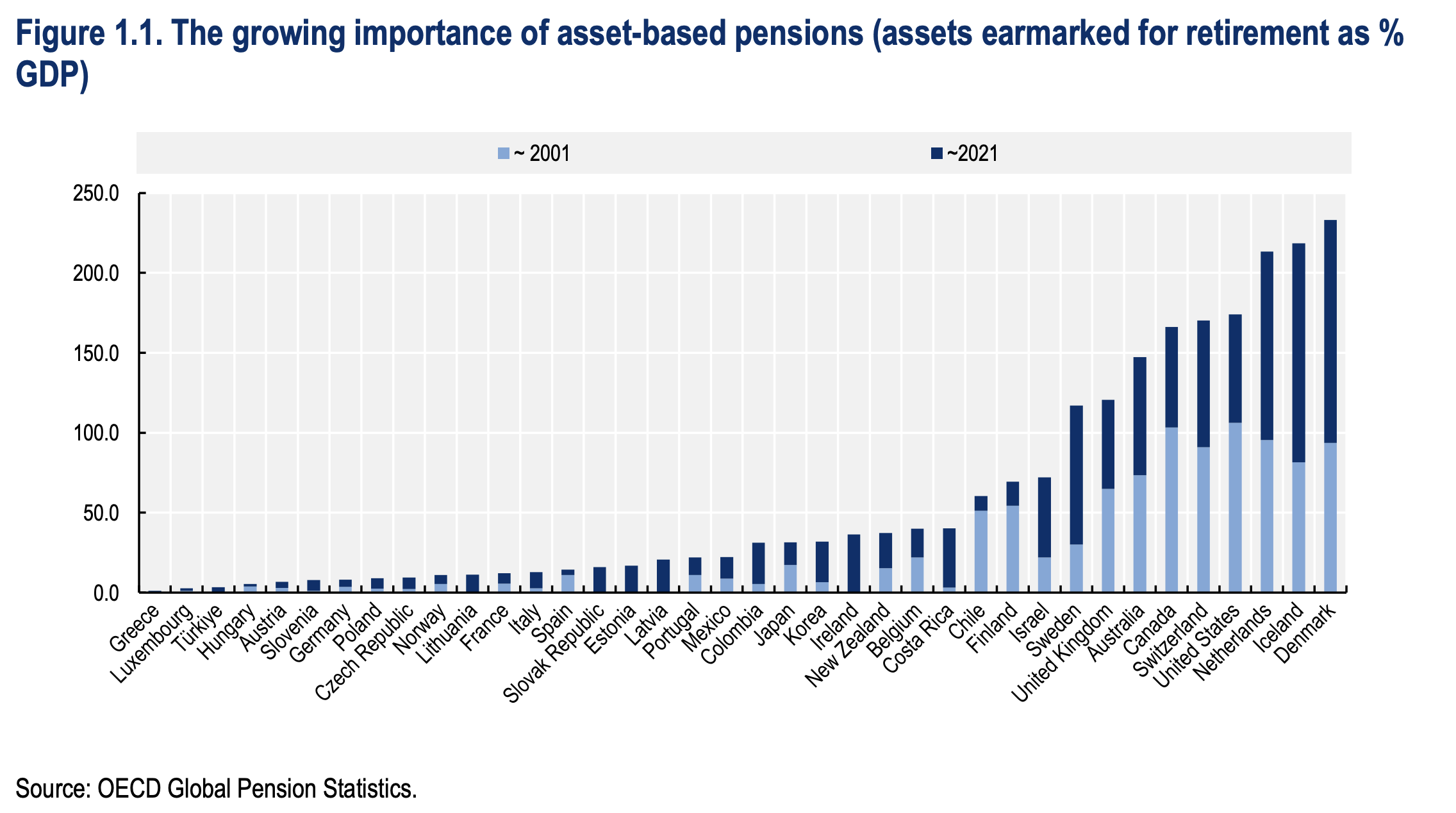 Negli Stati Uniti, dove queste entità sono fra le più ampie al mondo, i fondi pensioni hanno asset per l’83% del Pil, che perciò ogni anno devono circolare per il mondo cercando di far fruttare rendimenti sufficienti per i loro iscritti, molti dei quali, e questa è una circostanza poco apprezzata, hanno contratti a prestazione definita.