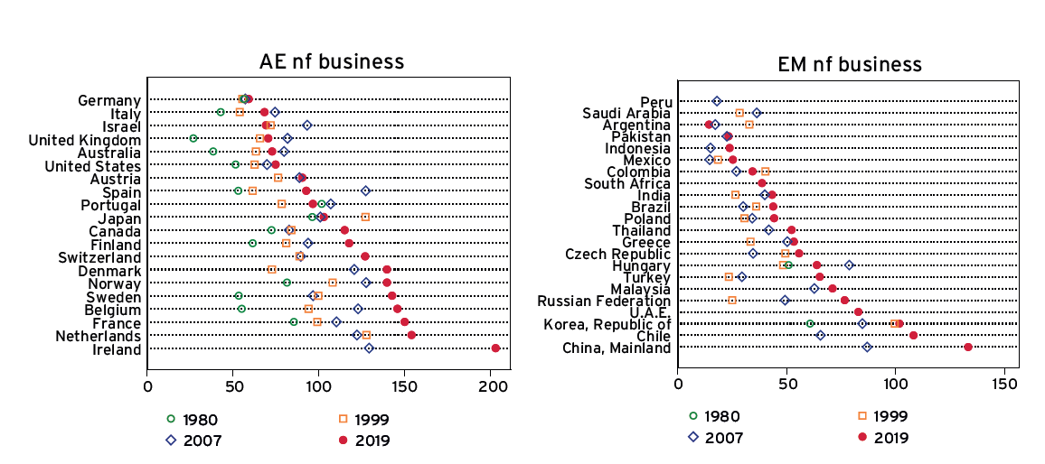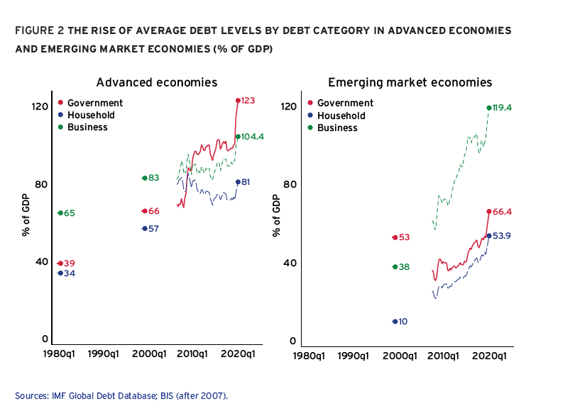 Cominciamo ricordando il livello di debiti. Gli autori del rapporto hanno osservato l’andamento dell’indebitamento per i paesi avanzati dal 1980 e per gli emergenti dalla fine degli anni ’90 che risultano sostanzialmente simili.