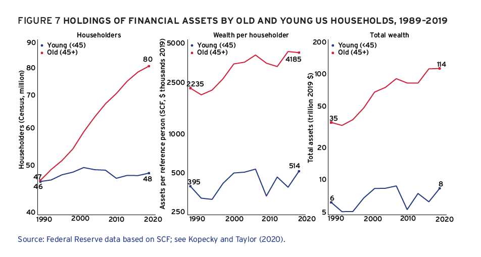 Quanto agli anziani, gli argomenti non sono tanto diversi da quelli del 2005. Aumento della durata della vita e quindi intensificazione dei risparmi per garantirsi una vecchiaia, oltre che lunga, serena. Piccolo problema, i dati americani confermano un trend osservato più volte: l’accumulazione di asset favorisce gli anziani ma non i più giovani. E questo per una serie di ragioni: da quella che gli anziani crescono relativamente in numero (+70% negli ultimi 30 anni) e quindi per peso relativo di asset: il valore medio della ricchezza di un anziano è cresciuto del 126% in trent’anni, a fronte del 44% dei più giovani. Perciò il totale degli asset dei senior è cresciuto (in dollari del 2019) dal 15 a 57 trilioni, mentre quello dei giovani da due a tre trilioni.
