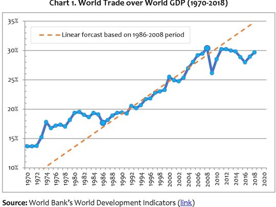 Sicché si può osservare che da un decennio il commercio globale, che della globalizzazione è il lato luminoso, ha preso a regredire senza più riuscire a catturare un trend che andava avanti da un quarantennio. Quindi la globalizzazione del commercio è andata in crisi, e con essa il benessere di molte popolazioni, con la conseguenza che queste società sono diventate populiste. Ciò per dire che forse non è stata la globalizzazione a generare il populismo, ma la de-globalizzazione, che pure il populismo auspica. Comunque sia, rimane il fatto che il commercio zoppica e le idee populiste galoppano. Quindi la globalizzazione non è terminata. Ora si chiama populizzazione.
