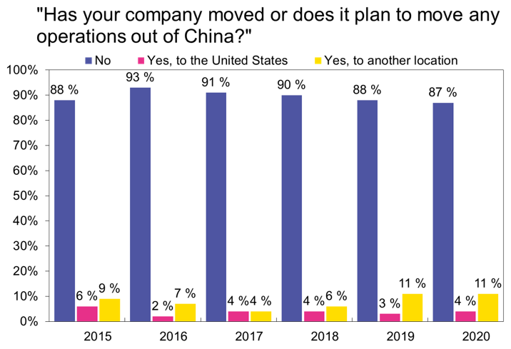Pur trattandosi di una survey, e quindi una semplice indicazione, vale la pena spenderci qualche riga per la semplice ragione che fotografa una tendenza che viene monitorata nel tempo, e quindi in qualche modo genera un’informazione utile. Ad esempio quando osserva che le imprese che pensavano di lasciare la Cina per tornare in Usa erano più numerose nel 2015 piuttosto che dopo quattro anni di amministrazione Trump. Il che, ne converrete, è alquanto curioso.