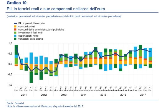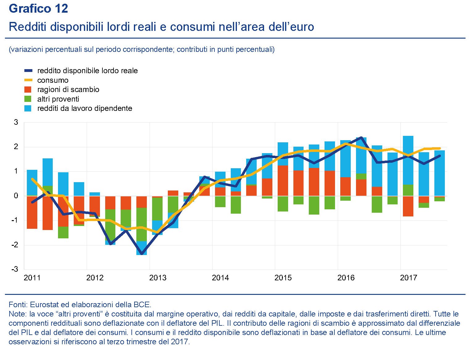 Per usare le parole della Bce, “dal momento che i redditi dei lavoratori dipendenti rimangono il motore principale della crescita dei consumi privati, questa continuerà ad essere sostenuta dall’incremento dei redditi reali”. E a tal proposito serve anche ricordare come si compone il pil dell’EZ.