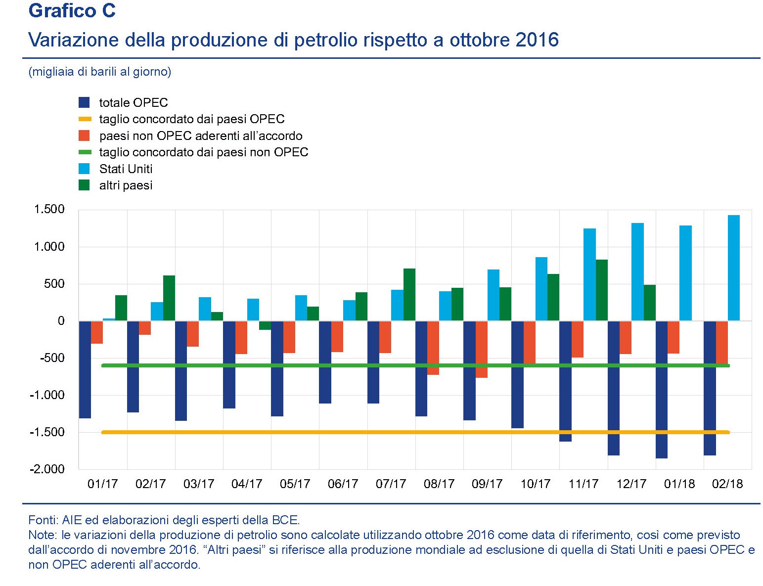 Lo sgambetto Usa all’Opec Ormai è chiaro a tutti che l’aumento della produzione petrolifera da parte degli Usa ha praticamente vanificato il taglio deciso dall’Opec, che ormai si avvia a diventare Opec plus con la Russia– si vocifera anche dell’ingresso dell’Azerbaijan nel cartello – per far fronte al crollo delle quotazioni petrolifere. L’effetto è chiaramente visibile da questo grafico estratto dal bollettino Bce.