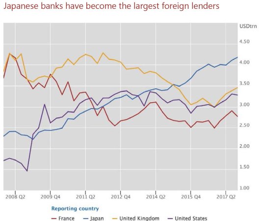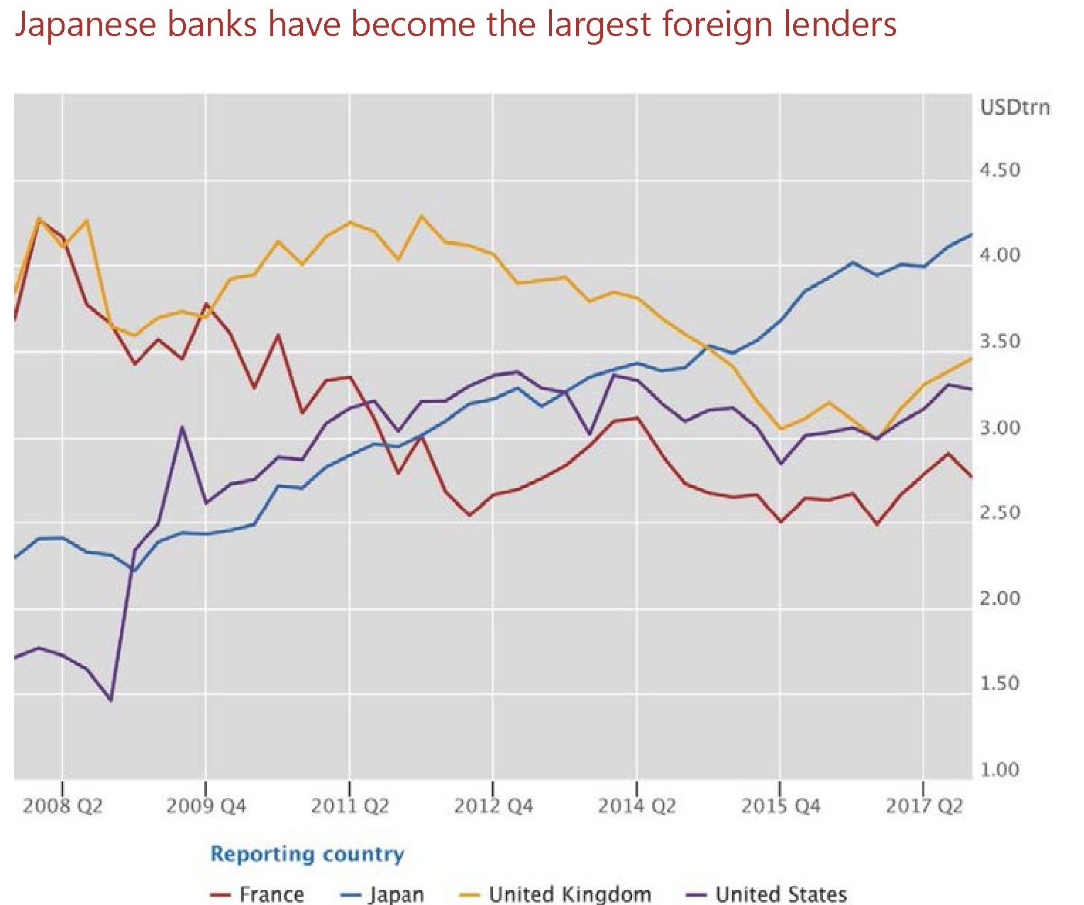 Le banche giapponesi battono tutti. La Bis di recente ha diffuso le statistiche bancarie che mostrano come le banche giapponesi siano diventate le prime prestatrici al mondo per asset totali. Ormai siamo oltre i 4 trilioni di dollari, ben sopra la Gran Bretagna, le cui banche sono le second prestatrici al mondo. La lunga marcia delle banche giapponesi è cominciata all’indomani della crisi, complice anche il QQE varato dalla BoJ che ha aumentato notevolmente le riserve delle banche commerciali dotandole perciò di enormi risorse per prestiti potenziali.