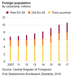 Effetti della politica migratoria tedesca. L’istituto tedesco di statistica ha diffuso i dati dell’aumento della popolazione straniera in Germania negli ultimi dieci anni, che mostrano un deciso aumento degli immigrati. A fine 2017 l’anagrafe conta 10,6 milioni di residenti stranieri.