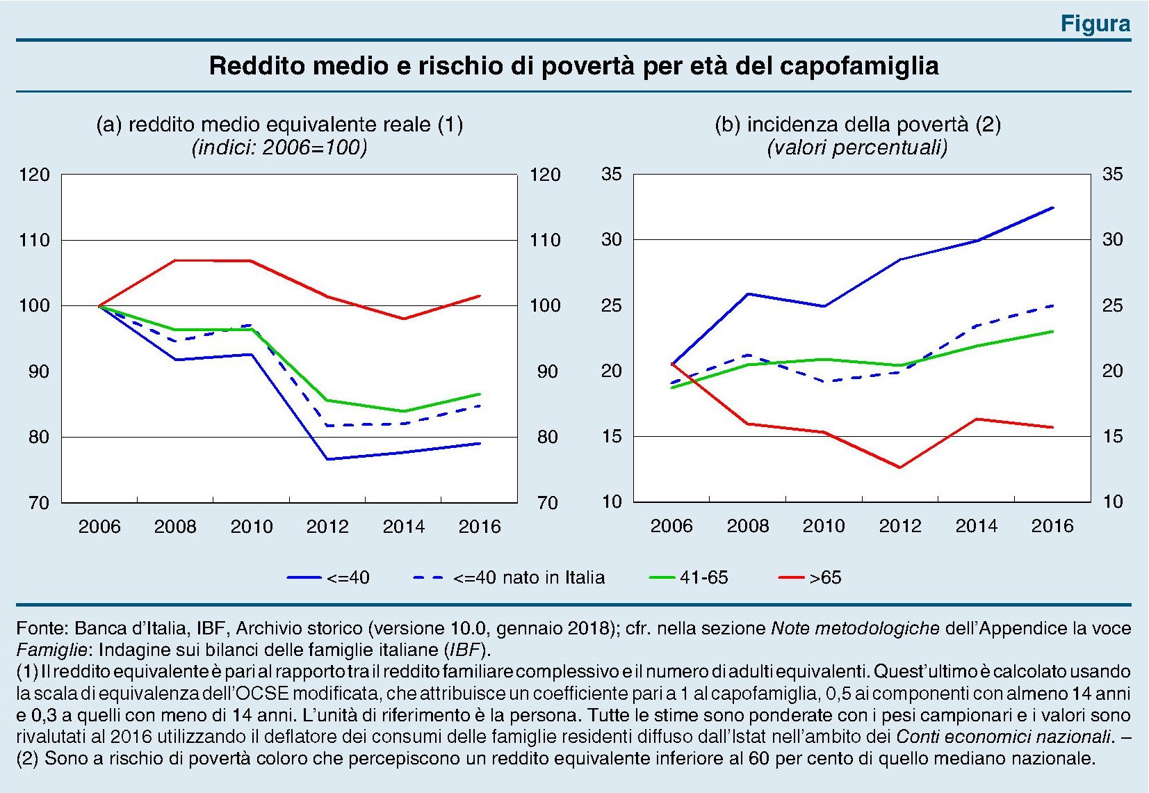 Il reddito degli italiani diventa vecchio. La Banca d’Italia nella sua ultima relazione annuale ha pubblicato un approfondimento sull’andamento della diseguaglianza nelle diverse classi d’età del nostro paese all’indomani della crisi dalla quale emerge che gli ultra65enni hanno visto crescere il loro reddito equivalente, anche se di poco, mentre i più giovani lo hanno visto crollare. Ciò ha fatto aumentare drammaticamente il numero di giovani poveri.
