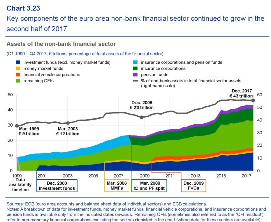A dicembre 2017 gli asset totale detenuti da questo settore quotavano 43 trilioni, il 56% dell’intero sistema finanziario, quindi più di quelli detenuti dal sistema bancario. Queste entità, che sono fondi pensione, assicurazioni, fondi di investimento, hanno potuto contare sull’aumento della ricchezza finanziaria dell’area per diventare sempre più capitalizzati e in certi periodi hanno persino compensato il credit crunch bancario acquistando obbligazioni corporate europee. Ma tale crescita ha alcune criticità. Sono aumentate le quote di titoli più rischiosi in pancia ai fondi di investimento e è aumentata l’interconnessione fra questi fondi. Inoltre buona parte investono sulle corporation Usa, concentrando un po’ troppo i rischi. Sarà interessante osservare cosa succederà in caso di guerra commerciale fra Usa e Ue.