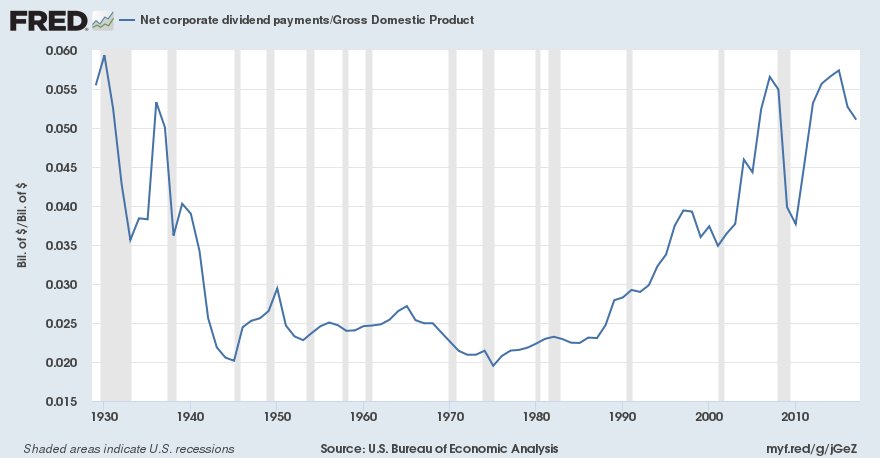 Questo andamento, che mostra come oggi il capitale paghi molto bene, a differenza del lavoro (la labor share declina da quarant’anni) ha consentito alla Corporation Usa di erogare dividendi per 990 miliardi nel 2017 ai suoi tanti azionisti.