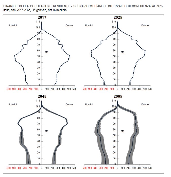 Il paese che saremo e quello che vogliamo essere. L’Istat ha aggiornato le sue previsioni demografiche sul nostro paese che confermano lo stato sempre più declinante della nostra popolazione. Nel 2065 si prevede che saremo oltre sei milioni di meno, ma soprattutto saremo sempre più vecchi come si può osservare scrutando la piramide demografica che diventa sempre più stretta alla base e si allarga sempre più in cima, delineando una società a dir poco instabile, dove l’economia viene completamente capovolta e a ragione.