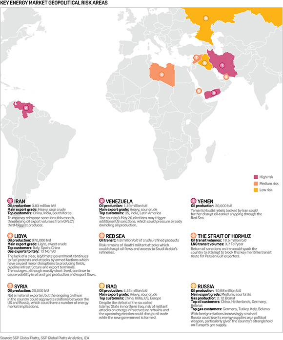 Goobye Iran: aumentano i rischi per il petrolio. Platts ha proposto un interessante approfondimento che illustra come le tensioni in varie parti del mondo mettano a rischio volatilità dei corsi petroliferi. Le grane maggiori potranno arrivare dall’acuirsi delle tensioni in Iran, visto che Trump ha deciso di abbandonare l’accordo sul nucleare che ha sospeso le sanzioni a carico della repubblica islamica, consentendole di tornare a vendere il proprio petrolio nei mercati internazionali. Ma la crisi iraniana può anche impattare su altre zone calde dove insiste il traffico petrolifero, a cominciare dallo stretto di Hormuz, che sta proprio sotto l’Iran, dove ogni giorno (dato 2016) passano petroliere che trasportano 18,5 milioni di barili, pari al 30% del totale del petrolio trasportato per mare.