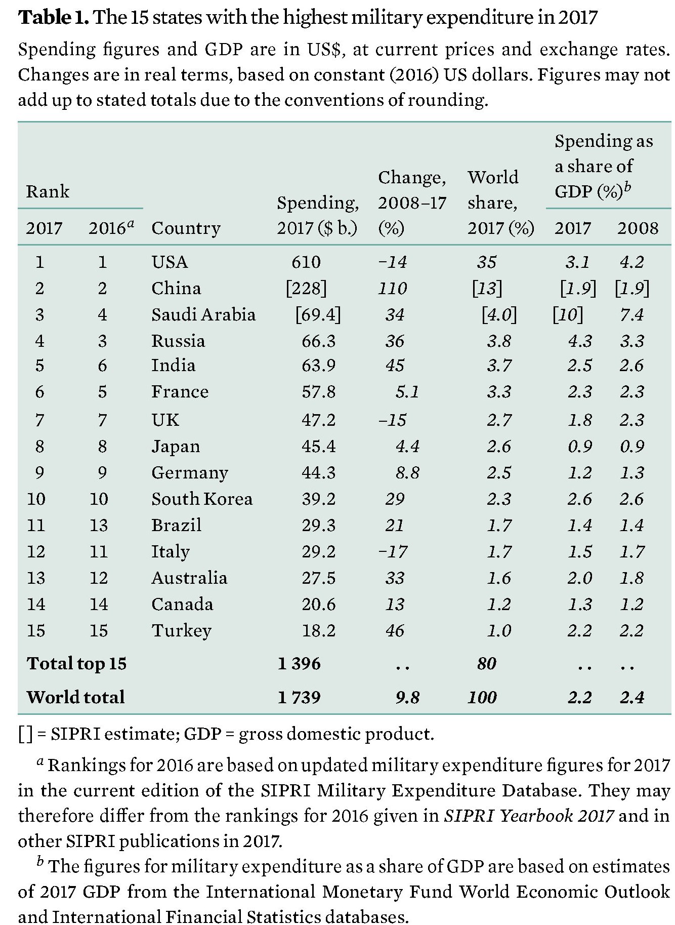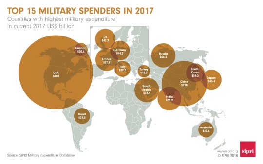 Il boom della spesa militare cinese. Il Sipri ha diffuso pochi giorni fa l’aggiornamento dei dati sulla spesa militare nel mondo per l’anno 2017 che confermano la crescita costante della spesa militare globale e la supremazia degli Stati Uniti che conservano con oltre 610 miliardi il primato della spesa.
