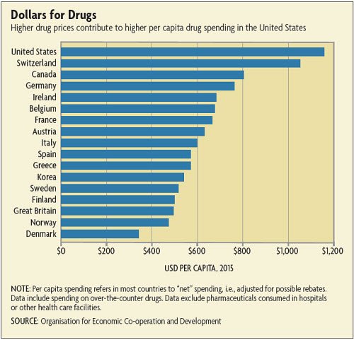 Sbaglierebbe chi pensasse che l’elevato costo dei farmaci dipende dal fatto che il governo non contribuisce alla spesa sanitaria. Negli Usa, infatti la spesa per farmaci con obbligo di prescrizione è stata pari a circa 330 miliardi di dollari nel 2016, l’1,8% del PIL, e il governo ne ha pagato più del 40%. La spesa sanitaria è pari al 18% del PIL e l’assistenza sanitaria è il terzo settore di occupazione. Ciò malgrado molti cittadini sono costretti a scegliere fra mangiare e curarsi a causa dell’alto costo dei farmaci che non è soggetto ad alcuna regolazione.