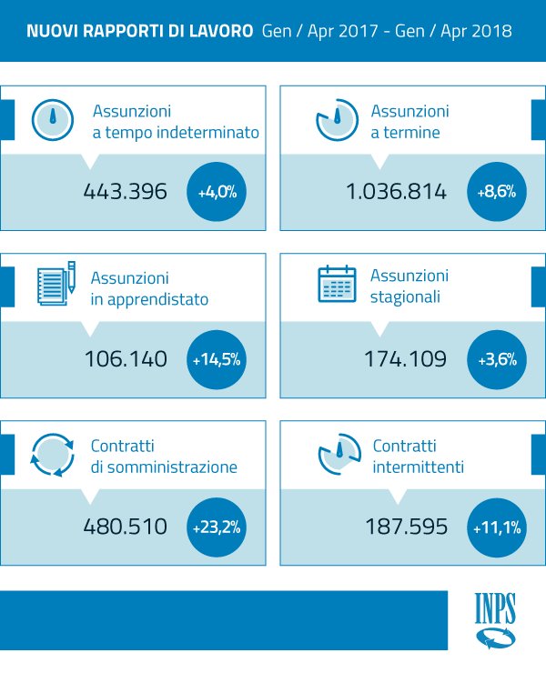 Il lavoro in Italia secondo l’Inps. L’Inps ha pubblicato gli ultimi dati, aggiornati ad aprile, sui contratti di lavoro, mettendo a confronto i primi quattro mesi del 2018 con gli stessi del 2017.