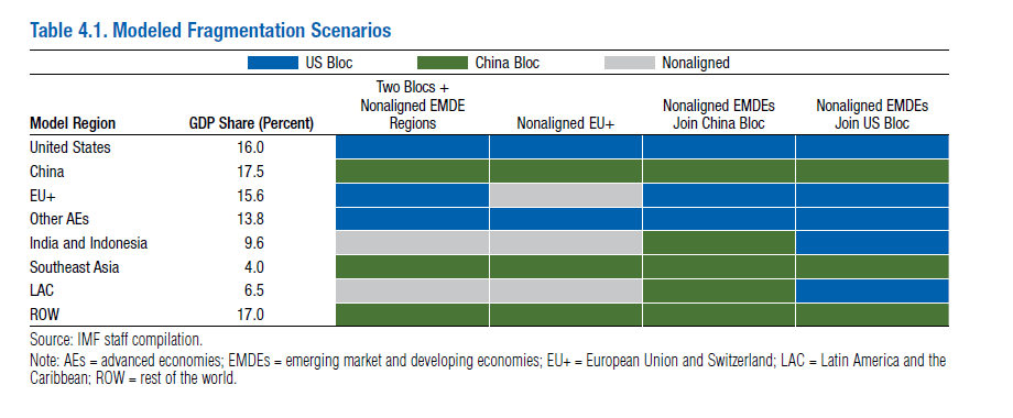 Nei vari scenari elaborati dal Fondo, quella che immagina un mondo diviso in due blocchi – Usa e suoi satelliti e Cina e suoi satelliti, con India, Indonesia e paesi caraibici non allineati – la crescita globale sarebbe l’un per cento più bassa dopo cinque anni dal verificarsi dell’ipotesi, con la tendenza ad arrivare al due per cento mano a mano che le restrizioni degli investimenti impediscono la formazione del capitale e quindi diminuiscono la produttività.