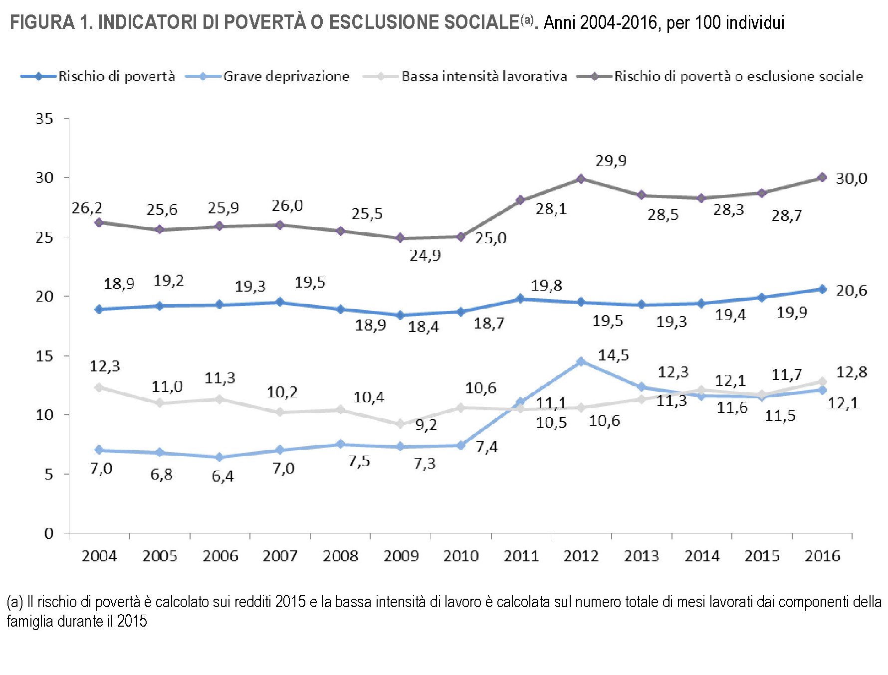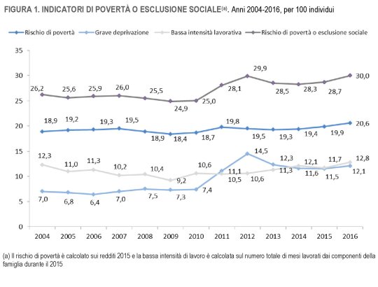 Vedete no? Il 30% è a rischio di povertà o esclusione sociale che moltiplicato per 60 milioni e rotti..fate voi i conti. Se pure ci limitassimo alla voce Grave deprivazione, scopriremmo che riguarda il 12,1 degli italiani che, secondo le definizioni Istat hanno almeno quattro dei seguenti problemi: