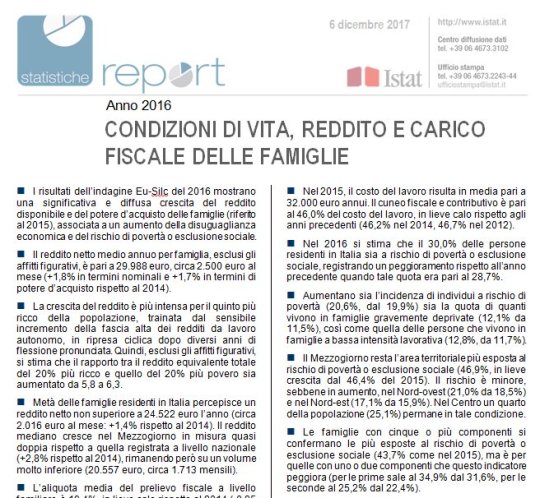 Questo per gli amanti del piagnisteo nazionale. Prima che vi strappiate i capelli e iniziate una colletta per i nostri sette milioni di probabili deprivati, ricordatevi sempre che questi dati sono frutto di indagini campionarie, svolte in questo caso su 21.325 famiglie pari a 48.316 individui. Magari siamo stati sfortunati col campione. Oppure abbiamo beccato i pochi che pagano tutte le tasse, vai a sapere.