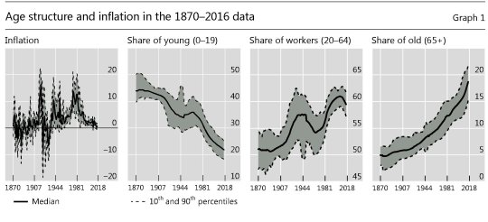 L’aspetto interessante del paper della Bis è che tale osservazione viene condotta su un ampio campione di paesi, 22 per la precisione, lungo un arco di tempo che inizia nel 1870. Gli studiosi ne hanno dedotto l’esistenza di un chiaro collegamento fra la struttura dell’età della popolazione e il livello dei prezzi, laddove una quota più ampia di giovani e anziani, quella che viene definita “popolazione dipendente”, è associata a una maggiore pressione inflazionistica, mentre una quota maggiore di popolazione in età lavorativa a una tendenza disinflazionistica. Prima di entrare nel dettaglio, guardiamo come si presentano complessivamente queste variabili nell’arco di tempo considerato.