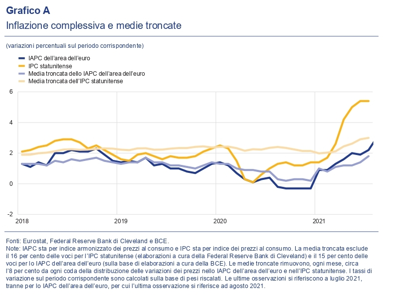 “Nel periodo da gennaio a luglio 2021 – nota la Bce – la media troncata dell’inflazione complessiva è aumentata di circa 1,0 punti percentuali per l’IPC statunitense e di 0,8 punti percentuali per lo IAPC dell’area dell’euro. Per contro, nello stesso periodo, l’inflazione complessiva misurata sull’IPC statunitense senza applicare le medie troncate è aumentata di 4,0 punti percentuali, mentre nell’area dell’euro l’inflazione misurata sullo IAPC è aumentata di 1,3 punti percentuali”.