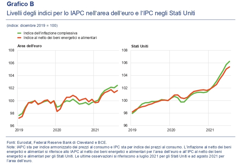 Nella zona euro, invece, “le misure di contenimento sono state revocate in un tempo successivo, con effetti ritardati sui servizi di trasporto e viaggio rispetto agli Stati Uniti”. Al contrario gli affitti hanno pesato sull’inflazione europea assai più che negli Usa.