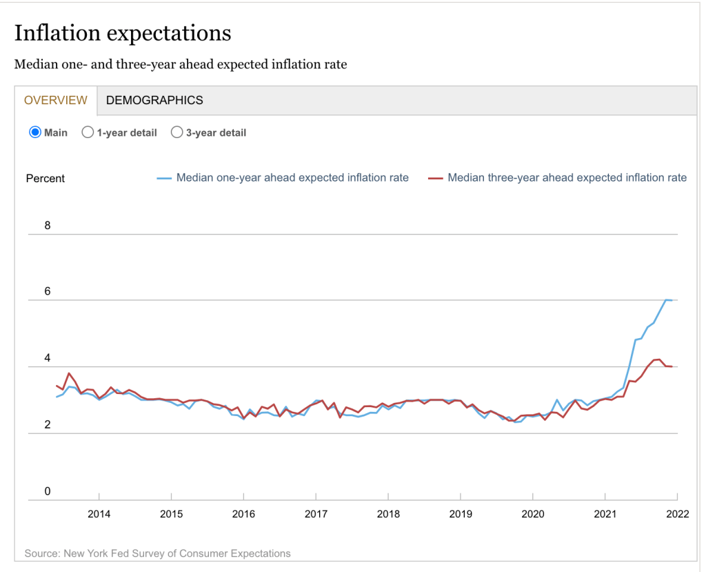 Altrove abbiamo osservato come questa inflazione abbia peculiarità molto particolari, e di come gli Usa ne abbiano alcune loro. Ma il punto interessante messo in evidenza dalla Survey della Fed di NY è che ormai i consumatori condividono la convinzione che la crescita dell’inflazione sarà ben al di sopra dei target di banca centrale, sia per l’anno in corso che per il medio periodo. E questo apre una domanda molto importante sul futuro delle retribuzioni, in Usa già cresciute parecchio. I dati diffusi dal dipartimento del lavoro Usa, che mostrano un indice dei prezzi al consumo cresciuto del 7% su base a annua a dicembre, disegnano scenari poco rassicuranti a tal proposito. E la Fed non potrà più ignorarli. Le persone ormai si aspettano più inflazione.