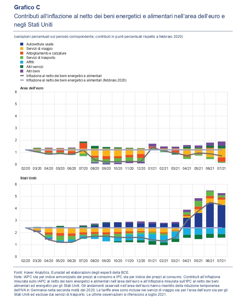 “Nel periodo da gennaio a luglio 2021 – nota la Bce – la media troncata dell’inflazione complessiva è aumentata di circa 1,0 punti percentuali per l’IPC statunitense e di 0,8 punti percentuali per lo IAPC dell’area dell’euro. Per contro, nello stesso periodo, l’inflazione complessiva misurata sull’IPC statunitense senza applicare le medie troncate è aumentata di 4,0 punti percentuali, mentre nell’area dell’euro l’inflazione misurata sullo IAPC è aumentata di 1,3 punti percentuali”.
