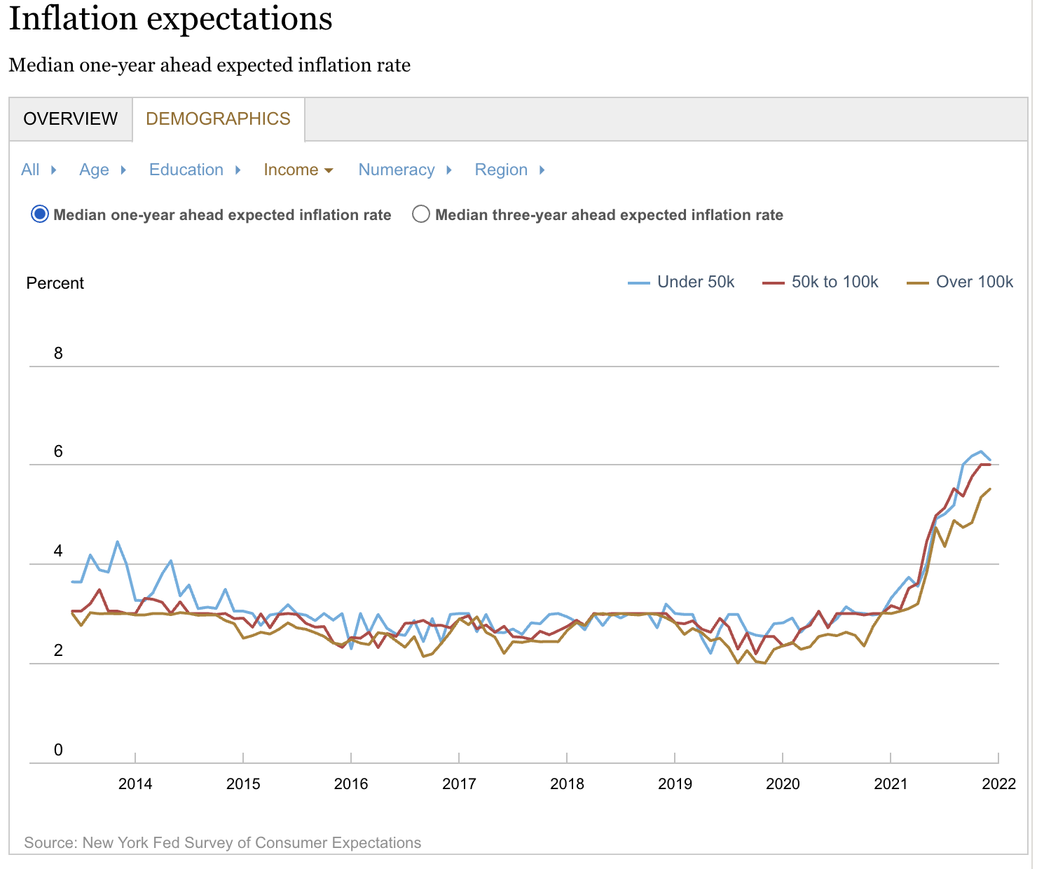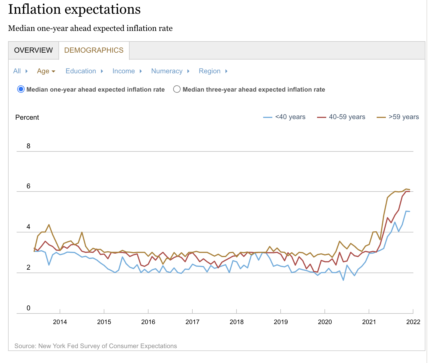 Chi, più o meno a ragione, sostiene che gli Usa siano alle prese con profonde divisioni di vedute al proprio interno dovrebbe dedicare qualche minuto alla lettura dell’interessante survey prodotta dalla Fed di New York su una questione che invece mette d’accordo tutti: l’inflazione. Scoprirà che gli Usa, o almeno i consumatori Usa, nelle loro diverse articolazioni di età, ingegno e redditi, sono sostanzialmente concordi nell’aspettarsi inflazione assai più alta del solito non solo per quest’anno, ma anche per i prossimi tre.