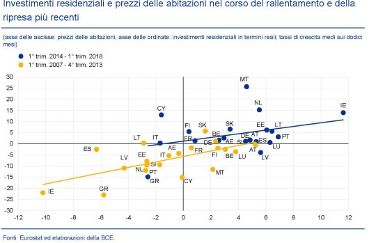 Per una serie di ragioni che non serve riepilogare qui (ma chi volesse conoscerle può leggere l’ultimo bollettino della Bce) è molto importante monitorare lo stato del mercato immobiliare per avere contezza dello stato di salute di un’economia. E questo spiega perché le banche centrali dedichino costanti approfondimenti a questa tematica che vale sempre la pena leggere. Tanto più considerando che da noi il mercato immobiliare sta vivendo una fase che, a voler essere buoni, potremmo definire di stagnazione, a fronte di una ripresa che nell’EZ, intesa come un tutto, va avanti da quattro anni.