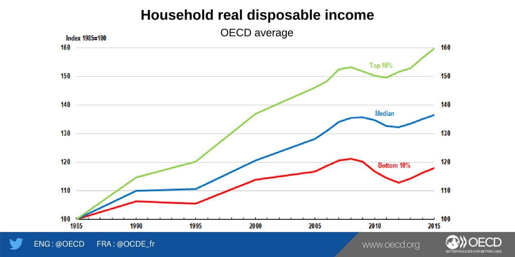 Traduco per i daltonici e i presbiti: negli ultimi trent’anni, a livello Ocse, quindi in 17 paesi fra i quali il nostro, i redditi più elevati sono cresciuti del 60%, quelli mediani del 40% e quelli più bassi del 20. Il che fa il paio con quanto ci ha ricordato ieri Bankitalia, riferito espressamente al nostro paese.