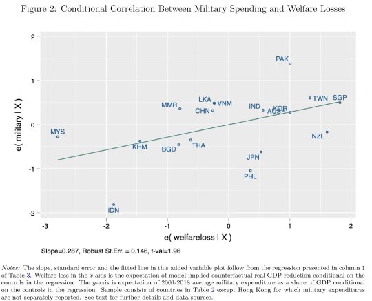 Per questi paesi la perdita di Pil viene associata a un aumento della spesa militare, “suggerendo che questi paesi rispondono al rischio percepito e ai costi di un possibile conflitto”.