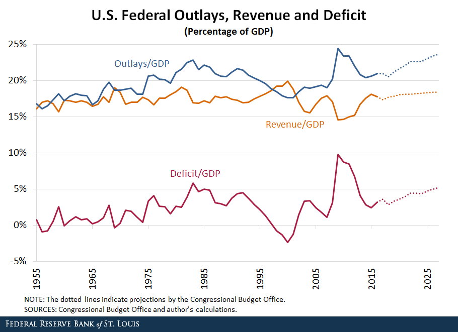 Il debito crescente degli Usa. La questione del debito globale degli Usa, arrivato secondo i dati diffusi dal Fmi al 259% del Pil, è particolarmente rilevante perché com’è noto gli Usa, oltre ad avereun peso specifico economico di tutto rilievo – si pensi a quanto conta la domanda Usa per il commercio internazionale – sono il paese che emette la monete che di fatto è la moneta internazionale. Una situazione che lega l’economia globale a filo doppio con quella statunitense. Perciò osservare l’andamento del debito Usa, e in particolare quello del governo, è importante per moltissime ragioni. A tal proposito di recente la Fed di S.Louis ha osservato che il futuro della contabilità pubblica Usa è tutt’altro che roseo. La circostanza di spese insopprimibili in aumento (sanità e social security), che aumenteranno dal 20,9% del pil del 2016 al 23,6% nel 2027, associata alla stagnazione delle entrate fiscali, dal 17,8% al 18,4% provocheranno una crescita del deficit dal 3,2% del pil al 5,2% e del debito.