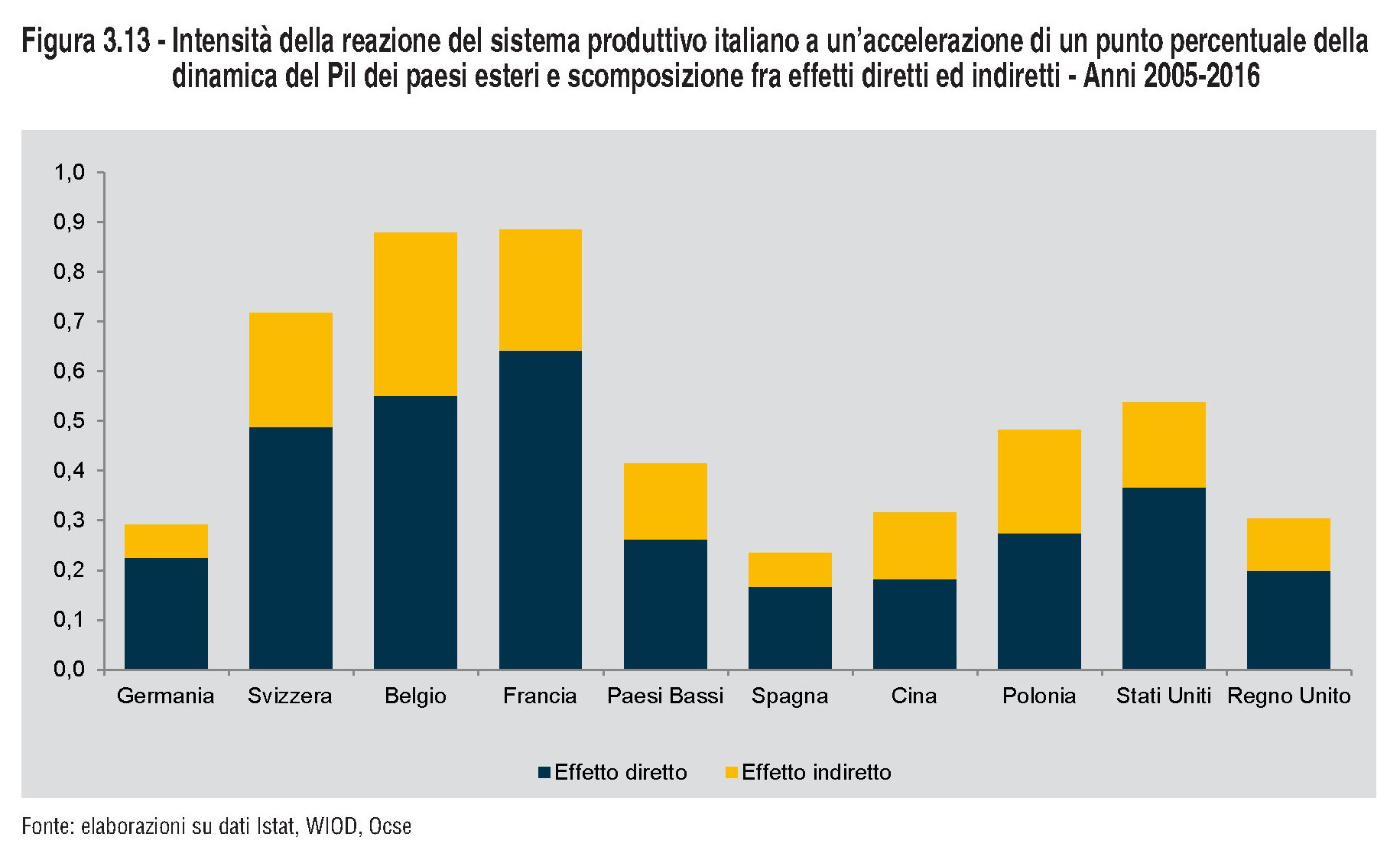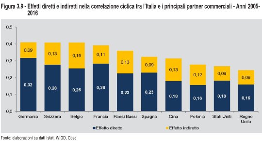 Come si può osservare, l’Italia è assai più sensibile agli andamenti di Svizzera, Belgio e Francia, nonché degli Stati Uniti, più che a Germania e Cina. Quest’ultima però ha effetti diretti inferiori rispetto a quelli della Germania, ma indirettamente superiori.
