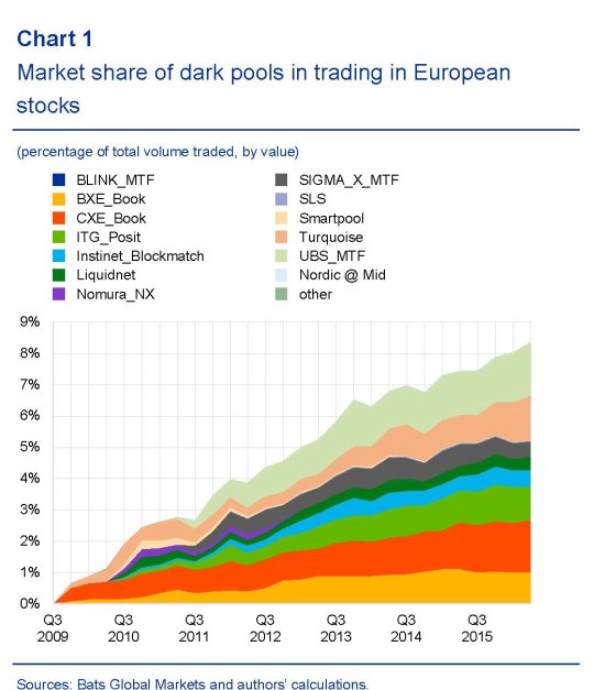 La Bce ci informa che “la struttura del trading nei mercati è molto cambiata” proprio grazie alle nuove direttive e la pratica delle dark pools “che implica una ridotta disponibilità di informazioni pre-trade oltre a un aumentato livello di frammentazione di mercato che possono essere nocive per la liquidità”. I critici dicono che la mancanza di trasparenza fa male alla liquidità. I favorevoli che comunque la quota di mercato delle dark pools è troppo ridotta per avere effetti sistemici. Per ora almeno, e neanche tanto, come vedremo.