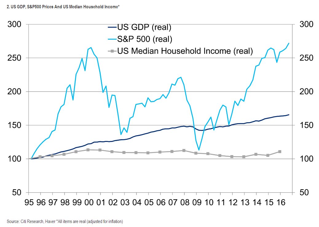 Lo so che è un colpo basso tirare fuori la solita storia dei redditi piatti a fronte della crescita delle borse – redditi mediani, attenzione – però questa roba rimbalza come una molla nel cronicario globale, trattando di un malanno che i cervelloni additano come ragione della deriva populista che li spaventa a morte. Una storiella niente male, che ha il vantaggio di convincere un sacco di persone. E che giustifica quell’altra storiella che ormai ci raccontano ogni giorno, ossia che bisogna tornare a fiscalizzare, usare il governo per spendere e distribuire. Sarà, intanto ho trovato quest’altra cosa.