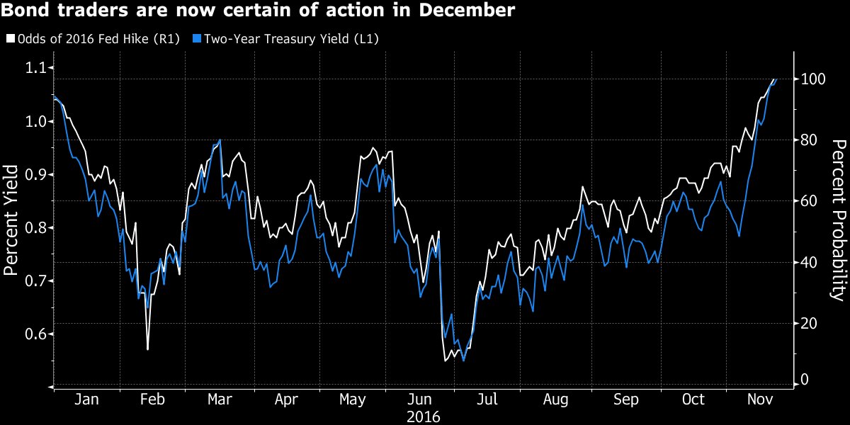 Oggi perciò, come ieri, è il giorno di Hillary Trump, ma in versione T-Blond, l’uomo fascinoso del momento, l’appuntamento col destino, il guaritore di scrofola. Passata la paura tutti di corsa a sperare nel nuovo Re Taumaturgo. Sicché la sintesi migliore di questa mezza giornata la trovo in questi due grafici, uno postato su Twitter da Jamie McGeever, della Reuters