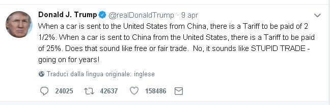 E mica solo alle automobili. La Cina ha annunciato misure nel 2017 che avrebbero portato gli investitori stranieri ad aumentare le quote nei settori finanziari, come banche e assicurazioni, e ora “garantiremo che queste misure si materializzino”. Mister Tweet sarà di sicuro soddisfatto. I cinesi anche.