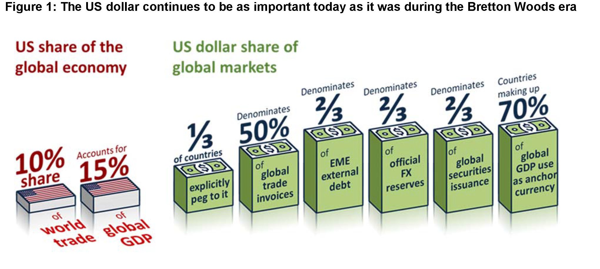 Sono passati più di quarant’anni da quando un sottosegretario al Tesoro Usa ricordò agli alleati che “il dollaro è la nostra moneta è un vostro problema”, ma siamo ancora a questo punto. E non potrebbe essere diversamente, visto che la geografia politica, per quanto profondamente mutata da allora, non è cambiata al punto da minare l’egemonia statunitense. Semmai il contrario. Il multilateralismo di cui tanto si discute oggi, con le torsioni cinesi per guadagnare un posto di spicco dei paesi che giocano nella seria A della politica internazionale, sono virgulti, per quanto suggestivi, di fronte alla robustezza della quercia americana, della quale il sistema monetario internazionale, ossia il dollaro, è parte costitutiva. Come la marina Usa domina gli oceani, il biglietto verde domina i mercati finanziari internazionali, come si può osservare dal grafico sotto, preso a prestito da un altro intervento andato in scena a Jackson Hole.