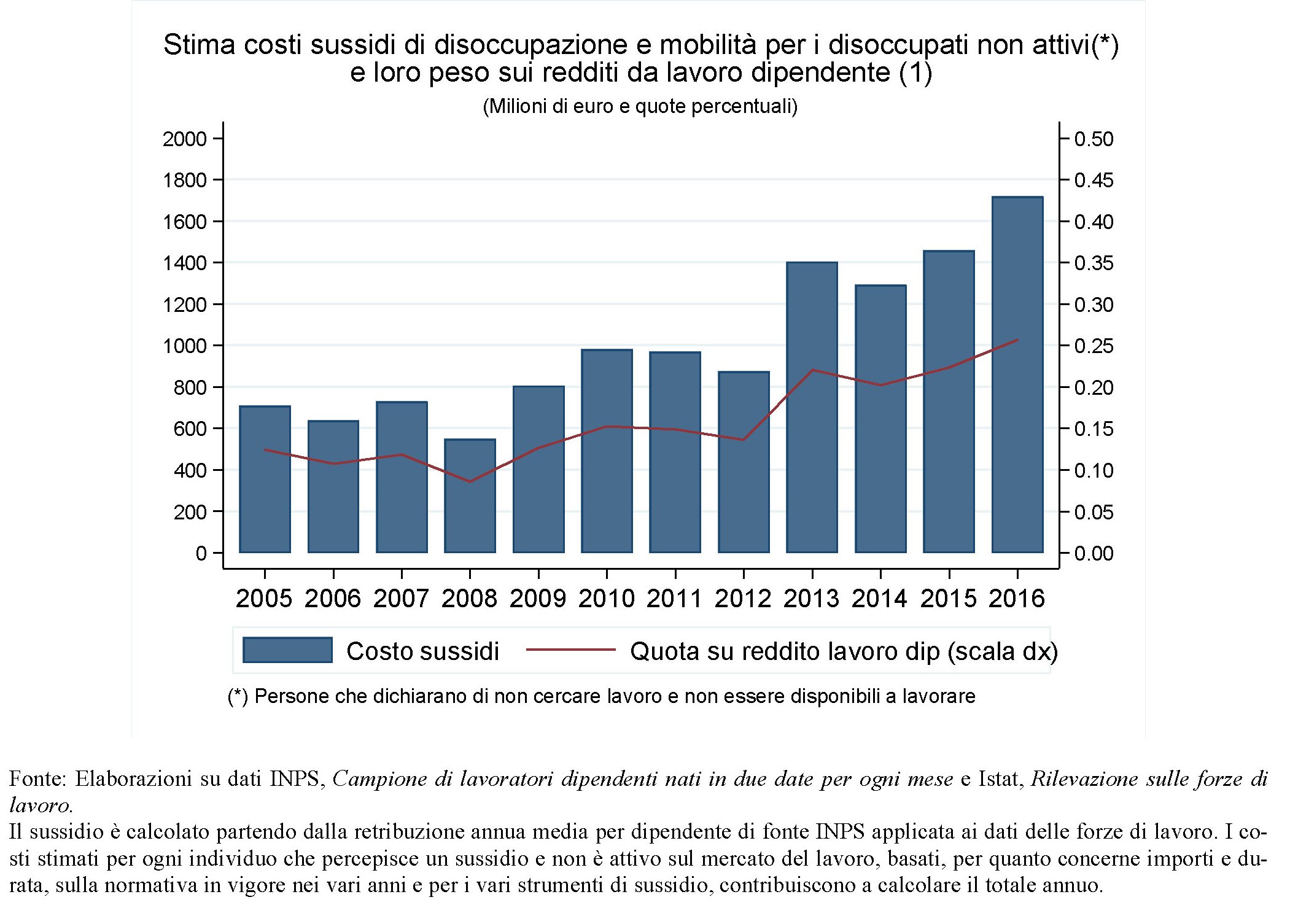 A fronte di questo contesto normativo, si può tentare un’analisi dei risultati ottenuti. “Nel 2016 il costo complessivo, al netto dei contributi figurativi, per i sussidi di disoccupazione è stato di 11,7 miliardi di euro, pari all’1,7 per cento del totale dei redditi di lavoro”. I dati di bilancio Inps mostrano che “soffermandosi sulle indennità di disoccupazione, la spesa, abbastanza stabile fino all’esplodere della crisi, sia poi velocemente aumentata raggiungendo i 17,6 miliardi nel 2016 (7,5 miliardi nel 2007); nello stesso periodo i sussidiati sono aumentati di oltre un milione, a circa 3 milioni”.