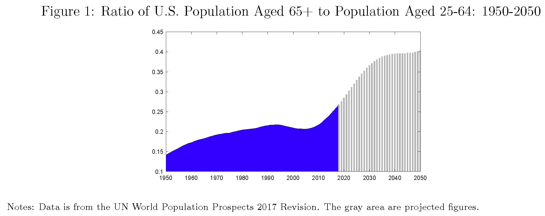 Nel 1950 c’erano meno del 15% di over 65 rispetto alla popolazione dei 25-64enni. Nel 2050 si prevede saranno praticamente il 40%. Il secolo americano finirà con i capelli bianchi. Non è il solo, come abbiamo visto.