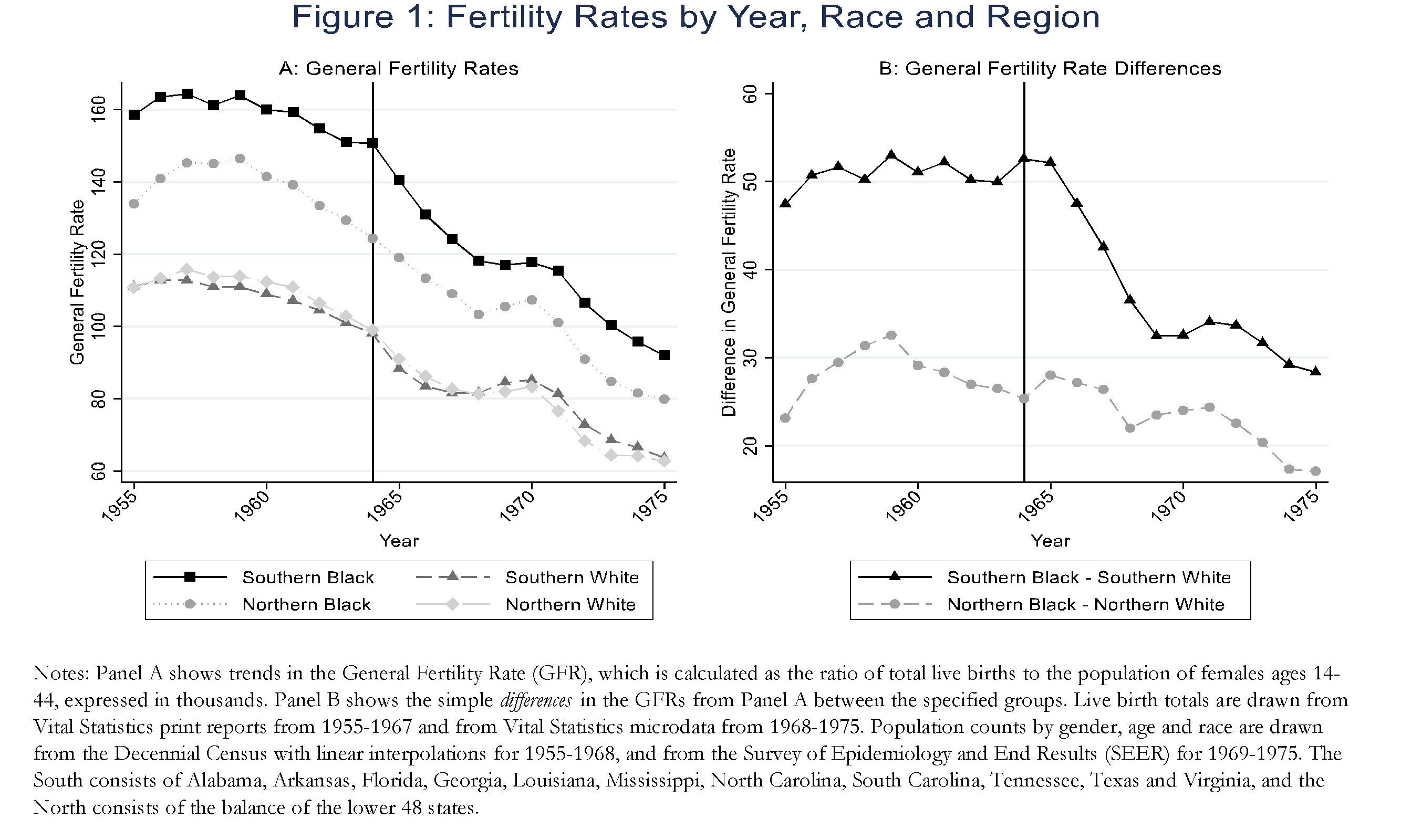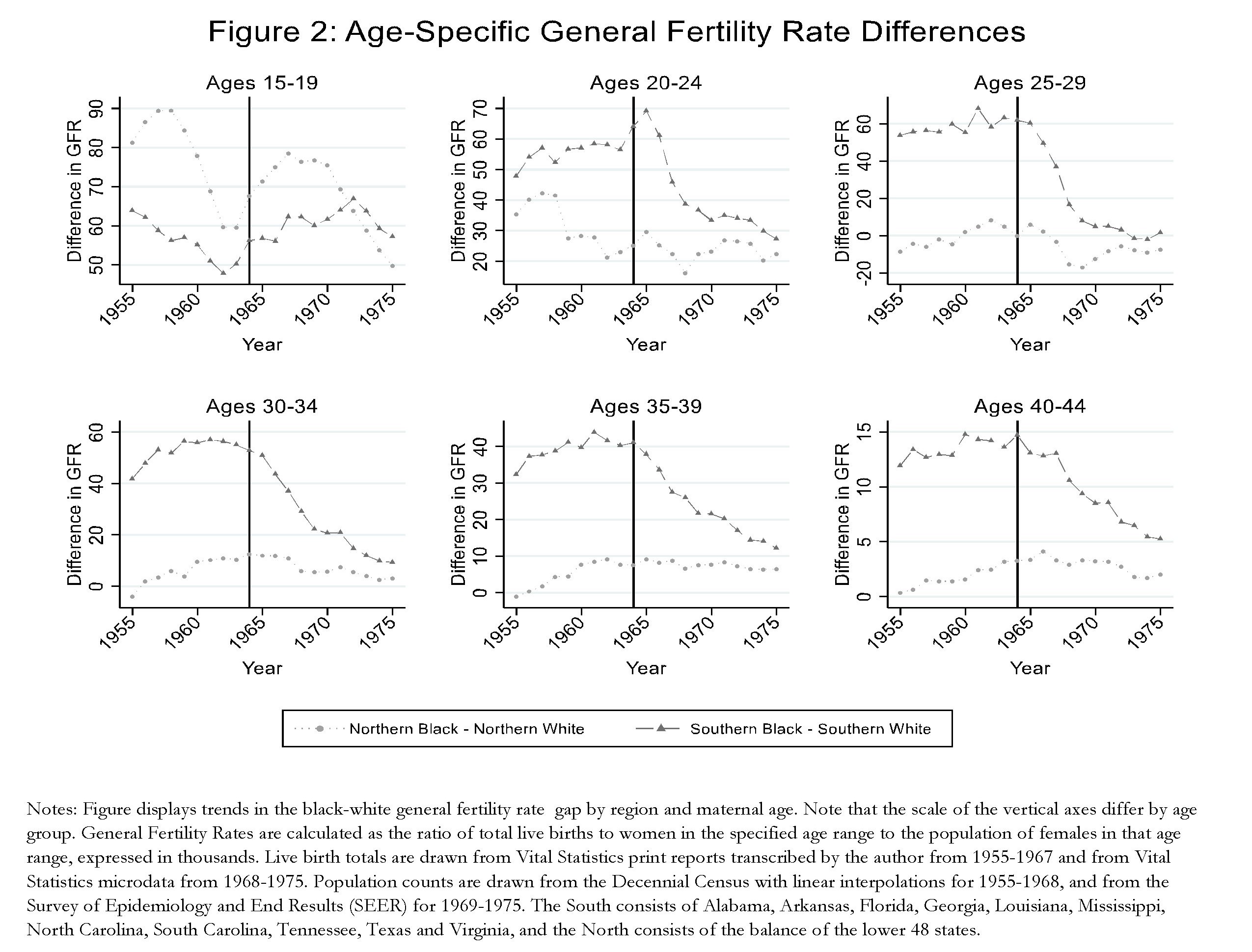 I risultati confermano i sospetti. Si è registrato “un declino qualitativamente ampio e discontinuo dei tassi di fertilità generale delle donne di colore del sud degli Stati Uniti immediatamente dopo il 1964, senza alcun calo comparabile tra le donne di colore del nord o le donne bianche in qualsiasi altra regione”. Si è innestato quindi quello che l’autore chiama “convergenza della fertilità” delle donne afroamericane del Sud verso la media nazionale. Il tasso di fertilità delle donne del Sud era di 151 figli ogni mille abitanti nel 1963 e scende a 118 nel 1969. Anche le donne bianche di tutte le altre regioni videro declinare il tasso di fertilità, ma non in quest’ordine di grandezza. Pure, si restrinse il gap di fertilità fra le due categorie osservate.