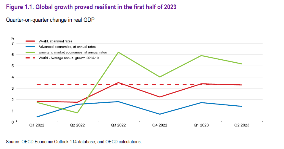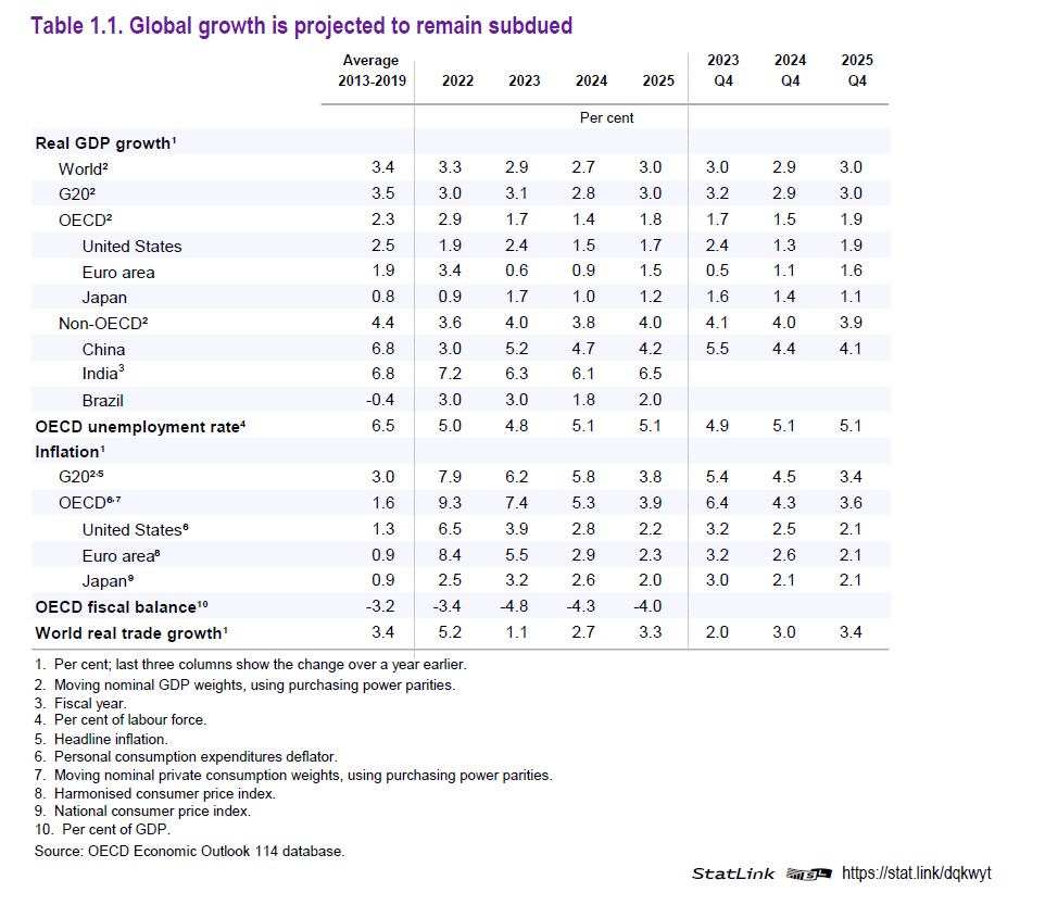 Dunque, secondo Ocse “in questo contesto, le principali priorità politiche consistono nel garantire una riduzione duratura dell’inflazione, nell’affrontare le crescenti pressioni fiscali e migliorare le prospettive di crescita sostenibile e inclusiva nel medio termine”. Laddove il contesto è quello che conosciamo di crescita poco dinamica, seppure con varie sfumature (Emergenti più veloci di Avanzati, Stati Uniti, fra gli avanzati, più veloci dell’Europa), inflazione ancora persistente e soprattutto appesa al filo sempre più sottile dei rischi geopolitici crescenti, che con molta facilità potrebbero far saltare quel fragile equilibrio di fattori che sta lentamente riportando i prezzi verso i target delle banche centrali.