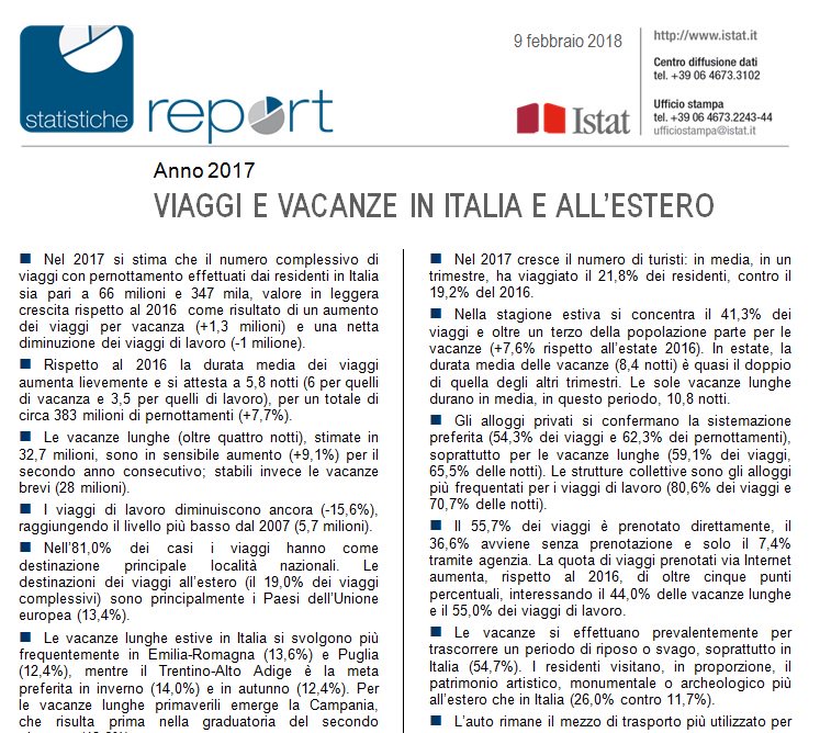 Si capisce già dall’inizio. La saggezza intendo: nel 2017 abbiamo fatto un milione e trecentomila notti di viaggi per vacanze in più e un milioni di notti in meno di viaggi per lavoro. Per il secondo anno consecutivo sono aumentate le vacanze lunghe (+9,1%) mentre i viaggi di lavoro (-15,6%) hanno raggiunto il livello più basso dal 2007.