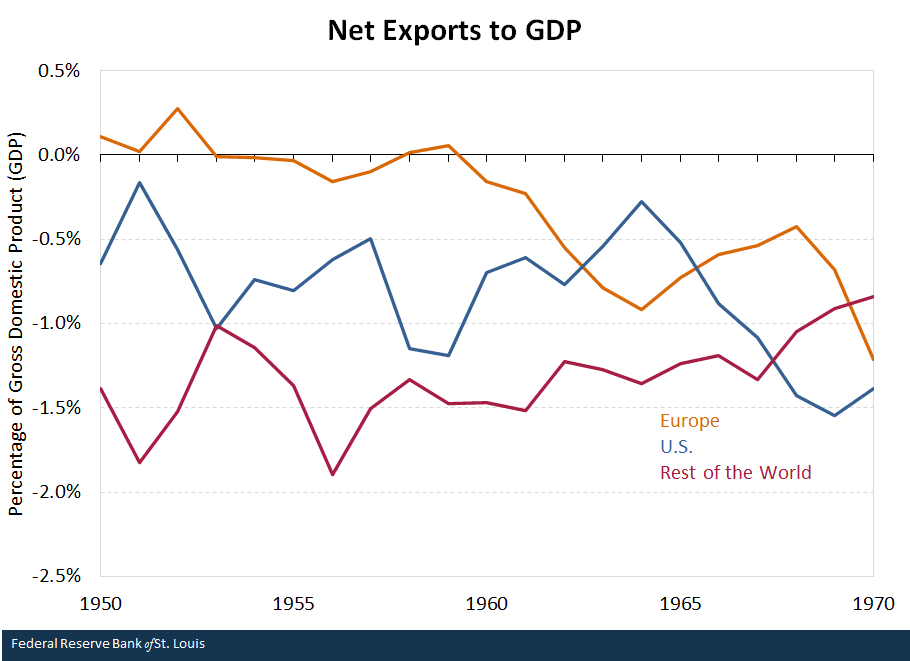 Detto ciò, vale la pena vedere i dati, visto che emergono alcune sorprese. La prima che merita di essere sottolineata e che, a differenza di quanto sostiene la vulgata, le esportazioni nette dell’Europa, misurate in rapporto al Pil nel ventennio 1950-60, ossia quello del boom, sono state alquanto piatte.