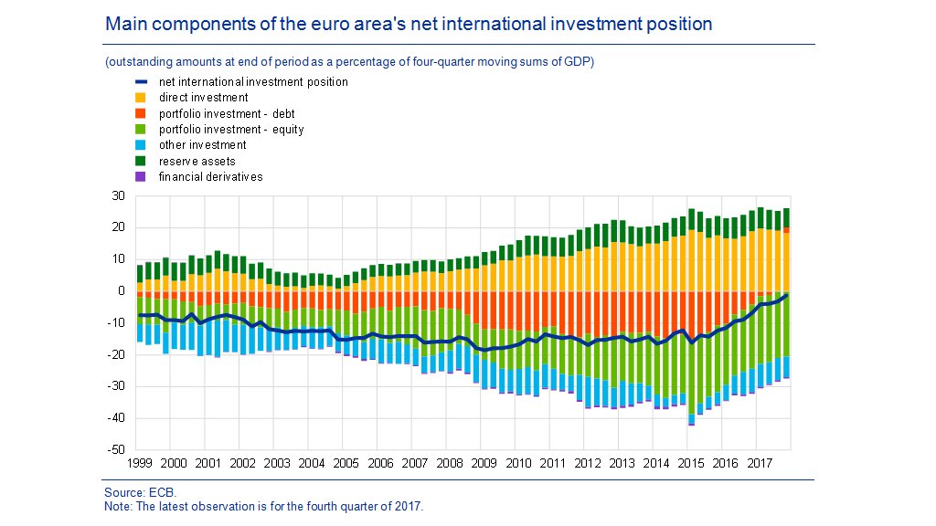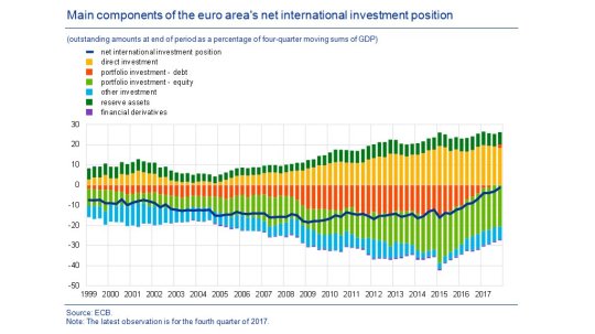 E’ un’epopea estremamente istruttiva quella raccontata nell’ultimo bollettino Bce, che illustra l’evoluzione dei conti esteri dell’eurozona negli ultimi anni durante i quali l’area è diventata sempre più ricca grazie ai suoi corposi avanzi di conto corrente. Il dato più eloquente è quello della posizione netta degli investimenti esteri, ossia il saldo fra le attività estere dei residenti (investimenti diretti, di portafoglio eccetera) e le attività che i residenti hanno nell’eurozona. Alla fine del 2017 l’eurozona aveva una posizione netta negativa di appena l’1,3% del pil dell’area, ai minimi storici, visto che per numerosi anni il deficit era stabile intorno al 15%. Un miglioramento “ampiamente riconducibile