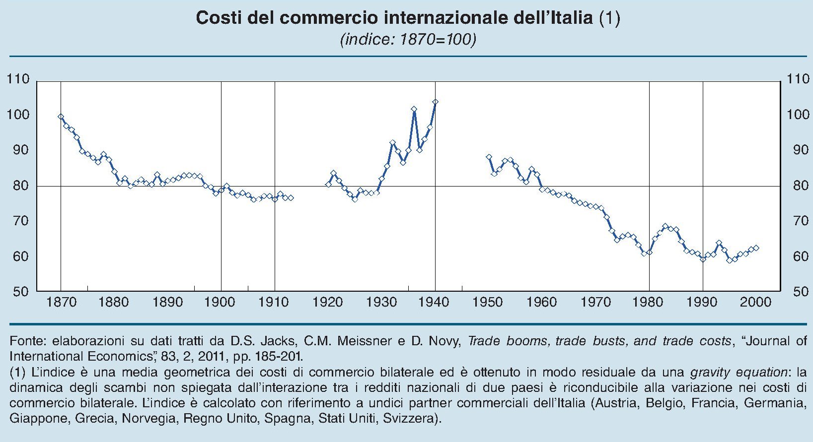 Perché questo indice ci interessa direttamente? Bankitalia lo spiega con chiarezza. “Al graduale smantellamento degli ostacoli al commercio, pur interrottosi tra le due guerre, si può imputare complessivamente circa il 40 per cento della crescita degli scambi bilaterali dell’Italia con i paesi partner considerati nell’analisi”. Al contrario, il protezionismo degli anni fra le due guerre è stato devastante per la nostra economia: “In sua assenza il volume del commercio italiano sarebbe potuto quasi raddoppiare nel periodo, si è invece dimezzato”.