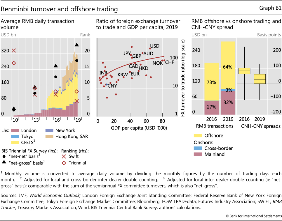Ricordare queste premesse ci aiuta a comprendere meglio l’analisi svolta dagli economisti della Bis, che parte da un primo dato rilevante: il renminbi, nel periodo di osservazione, che è quello della Triennal survey, ha rallentato la sua corsa. Pur arrivando a un turnover di 280 miliardi di dollari al giorno ad aprile 2019 – il turnover rappresenta il volume delle transazioni in valore – la moneta cinese è ancora all’ottavo posto per uso internazionale, con una crescita nel suo utilizzo che è risultata inferiore al previsto: il 4,3% nel 2019. A zavorrare la crescita è stato proprio il mercato CNH, per motivi che hanno a che fare con questioni squisitamente finanziarie, come ad esempio alcune restrizioni sul flusso dei capitali. La conseguenza è stata che “per la prima volta in più di dieci anni l’importanza relativa del mercato onshore (CNY, ndr) è aumentata mentre la quota del turnover del CNH è diminuita dal 73% del 2016 al 64% del 2019 (grafico sotto, pannello di destra).