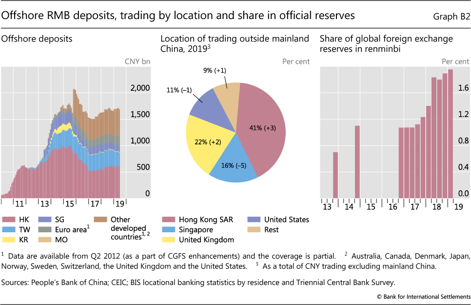 La Bis attribuisce il calo della quota offshore del RMB ad una serie di ragioni, fra le quali i rendimenti sui depositi offshore in ribasso che hanno scoraggiato gli investitori (grafico sotto a sinistra).